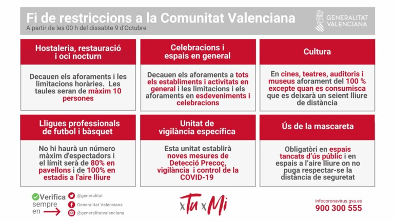 Puig ha anunciado que «decaen todos los aforos en todos los establecimientos y actividades en general», lo cual incluye la eliminación de limitaciones de foros en eventos y celebraciones, que si se celebran con público de pie deberán garantizar una separación de 2,25 metros.