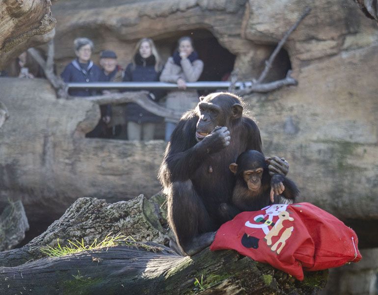 El acontecimiento ha sido estupendo para todos pues, además de entusiasmar a las familias con una imagen inolvidable para los más pequeños, los animales han disfrutado del momento asombrándose con todo lo inesperado que encontraban a su salida. Leopardos, chimpancés, gorilas, elefantes y suricatas han tenido hoy su celebración navideña con “adornos navideños” y “cajas regalo” llenas de juguetes y sus manjares favoritos. Especialmente emocionantes han sido los momentos protagonizados por “los peques” como el chimpancé Coco y los gorilas Pepe, Virunga y Félix y también su hermano mayor, Ebo.