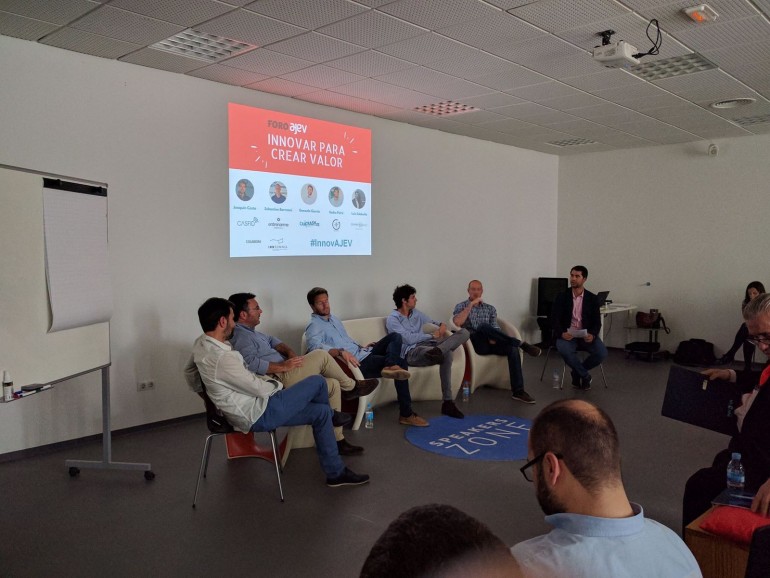 La Asociación de Jóvenes Empresarios de Valencia reunió ayer en Innsomnia a cinco grandes ejemplos de joven empresa valenciana en su primer foro sobre innovación, “InnovAJEV”. Luis Soldevila (Brandmanic), Gonzalo García (Carcrash), Joaquín Costa (Casfid), Sebas Borreani (Entrenarme) y Goiko Peiró (Grow Pro Experience), compartieron su experiencia en torno a la innovación con los más de 50 asistentes que no quisieron faltar a la cita.