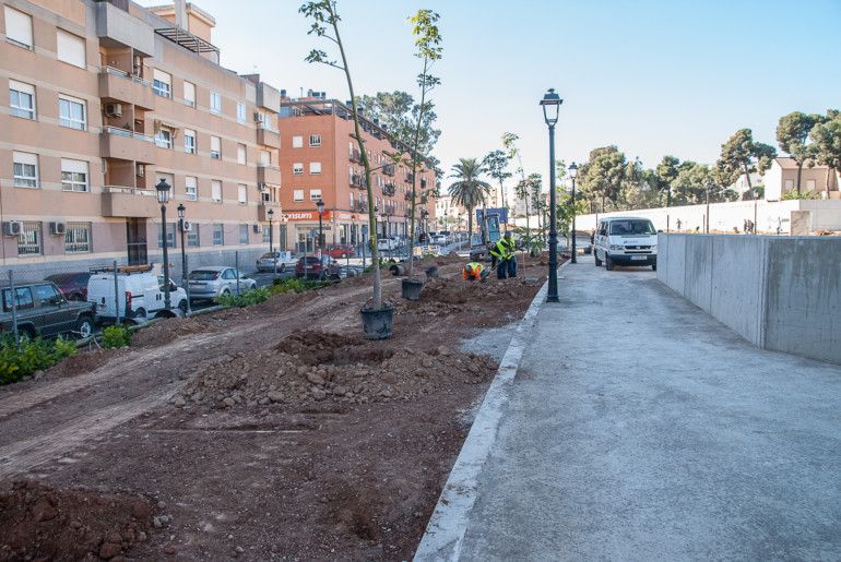 Los trabajos de jardinería se distinguen en dos áreas: el jardín que se construye sobre la losa del metro y el de fuera de dicha losa. En la primera de estas áreas, debido al espesor de la capa de tierra y la imposibilidad de instalar riego permanente y programado, se plantarán las siguientes especies: Cistus albidus (jara blanca), Cistus monspeliensis (jaguarzo negro), Lonicera implexa (madreselva mediterránea), Erica multiflora (brezo de invierno), Rosmarinus officinalis (romero), Chamaerops humilis (palmito), Cistus clusii (romerina), Helichrysum stoechas (siempreviva), Iris germanica (lirio común), Lavandula dentata (espliego de jardín), Thymus vulgaris (tomillo), Centranthus ruber (valeriana roja), Sedum album (uva de gato) y Sedum sediforme (uña de gato). En paralelo a los parterres que se van a ejecutar en esta área, se instalaran pequeños módulos de vegetación de flora mediterránea, con el objetivo de segregar el itinerario peatonal del ciclista y poder disponer de una franja ajardinada que minimice el impacto que supondría una gran superficie árida y dura si todo estuviera pavimentado sobre la losa del túnel del metro.