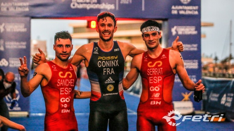 Mientras tanto la competición avanzaba y lo hacía a buen ritmo, con los españoles recortando posiciones, y manteniendo las primeras plazas al bajarse de la bici. Roberto Sánchez corría en casa y rápidamente arropado por los gritos del público marcó un ritmo rápido que le haría distanciarse de Antonio Serrat. No así del francés Dorian Coninx. En la última entrada a transición el podio quedaba sentenciado con Coninx en primera posición, Sánchez Mantecón en segunda y Serrat medalla de bronce.