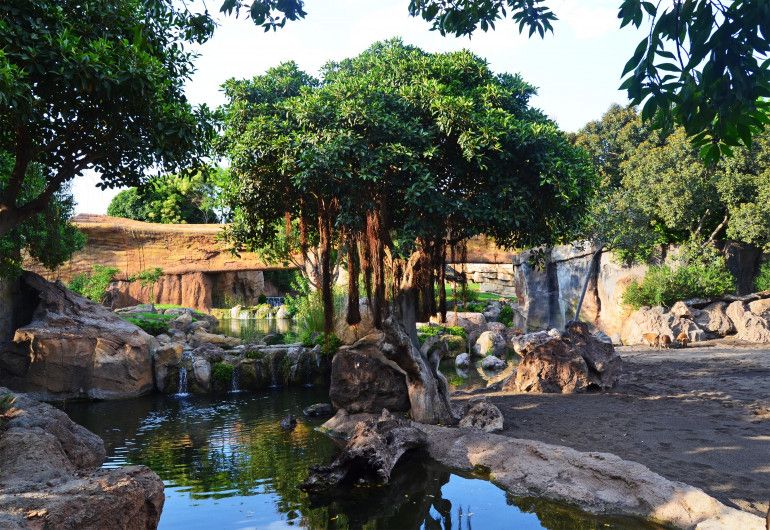 El “bai” de Bioparc Valencia que recrea un claro de las frondosas selvas de África ecuatorial, es una de las zonas que más llaman la atención de los visitantes, pues permite contemplar en un mismo campo visual a las especies que, en su hábitat natural, allí se reúnen: gorilas, chimpancés, búfalos rojos o los llamativos potamoqueros. Todo ello presidido por un gigantesco tronco caído que sirve, a su vez, de puente natural y extraordinario mirador sobre los bellos paisajes.