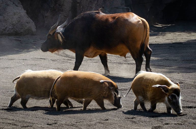 En esta espectacular zona destaca el colorido tono anaranjado de dos especies poco conocidas pero muy importantes para la conservación de la frágil biodiversidad de los bosques tropicales, los búfalos rojos y los potamoqueros rojos, que estos días han recibido a nuevos integrantes para sus grupos. Respecto a esta última especie, desde Bioparc Fuengirola viajó un macho que ya se ha unido perfectamente a las dos hembras. Y también han llegado dos jóvenes hembras de búfalo rojo procedentes del zoo de Madrid para sumarse a la manada de tres hembras y un macho, aunque en este caso todavía se encuentran en periodo de aclimatación. Ambas especies están incluidas como “Preocupación menor”, en parte por los pocos estudios que se tiene de ellas, en la Lista Roja de la Unión Internacional para la Conservación de la Naturaleza (UICN), por lo que el objetivo de estos traslados es potenciar los programas internacionales de conservación de los que forman parte.