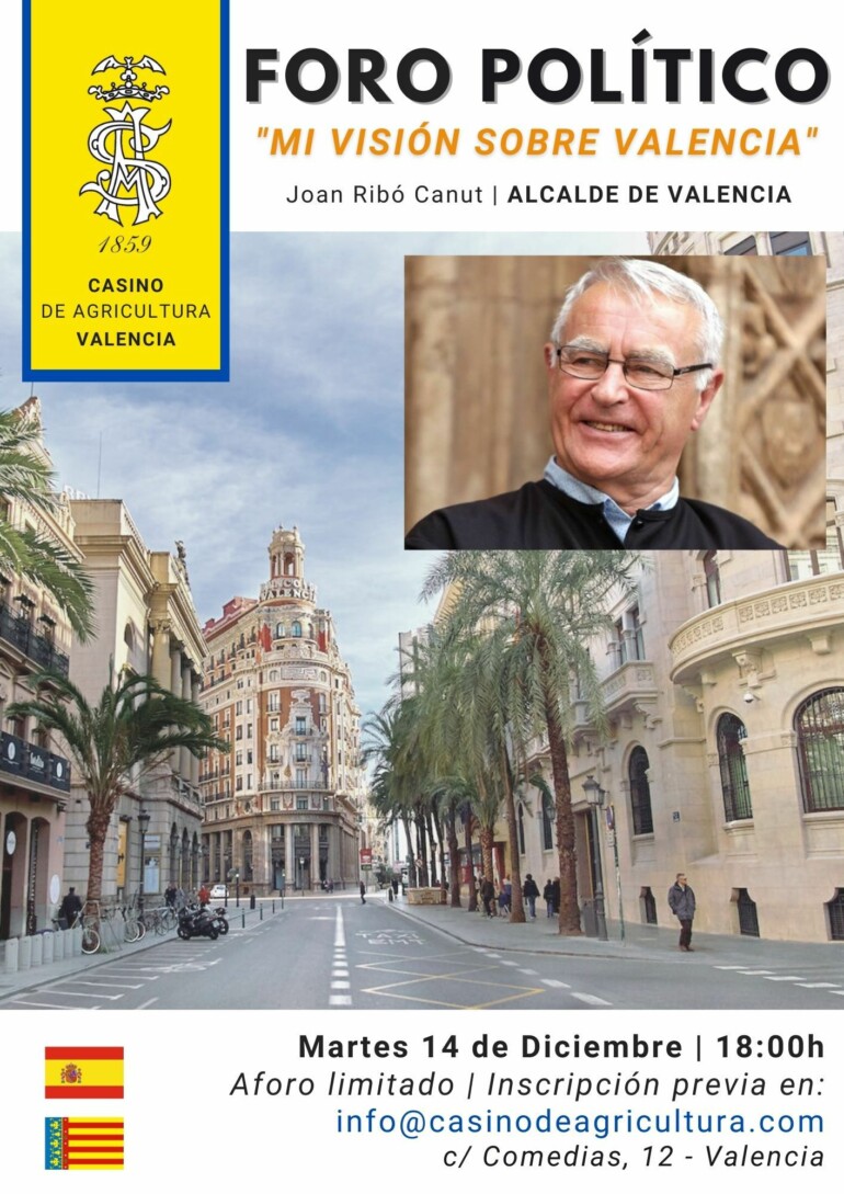 Joan Ribó, alcalde de València, hablará mañana martes, 14 de diciembre a las 18:00 horas en la sede de la Real Sociedad Valenciana de Agricultura y Deportes, conocida popularmente como Casino de Agricultura, sobre su visión de la ciudad. Con esta charla-coloquio dirigida por Javier Muñoz de Prat se inaugura un ciclo por el que pasarán todos los cabezas de lista de cada partido en el consistorio.