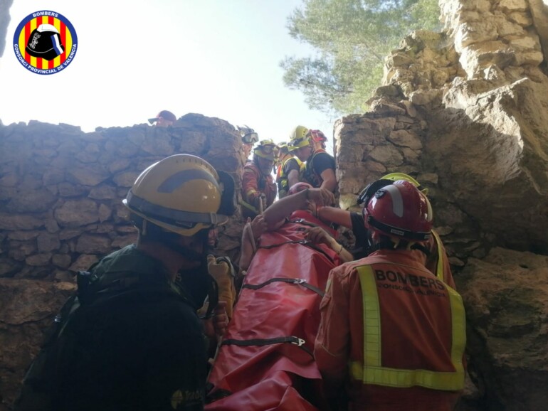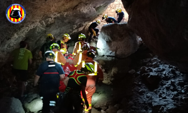 El Consorcio Provincial de Bomberos de València rescató este jueves a un hombre que se había lesionado dentro de una cueva en La Font de la Figuera. Según había alertado el acompañante, se encontraba a unos cinco metros de profundidad en la denominada Cueva Santa, y al lesionarse el pie no podía salir.