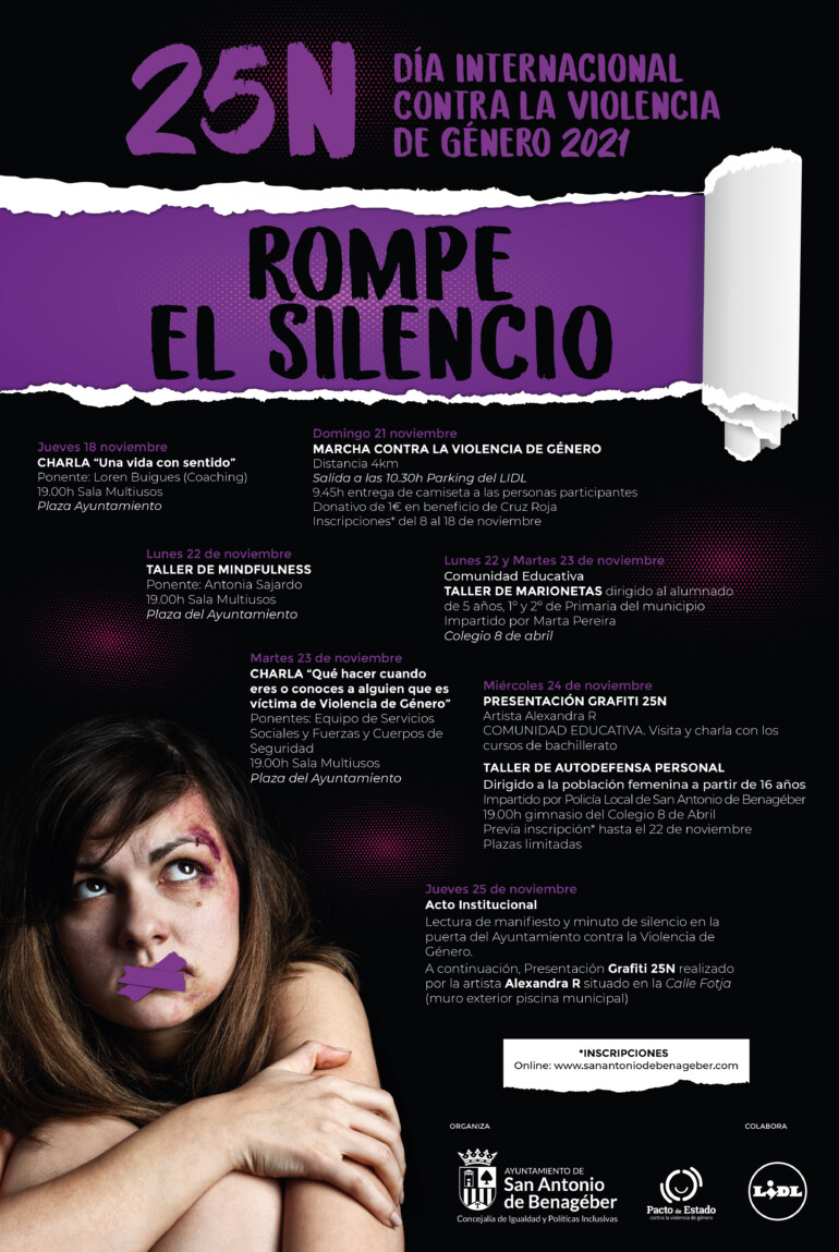 La concejalía de Igualdad y Políticas Inclusivas del Ayuntamiento de San Antonio de Benagéber conmemora el 25N: Día Internacional contra la Violencia de Género con una amplia programación de actividades. Este año, reivindicar el fin de esta lacra se hace más necesario que nunca, ya que, debido a la pandemia, han aumentado las llamadas al teléfono 016, y ha habido más denuncias que años anteriores, según datos del Ministerio de Igualdad.