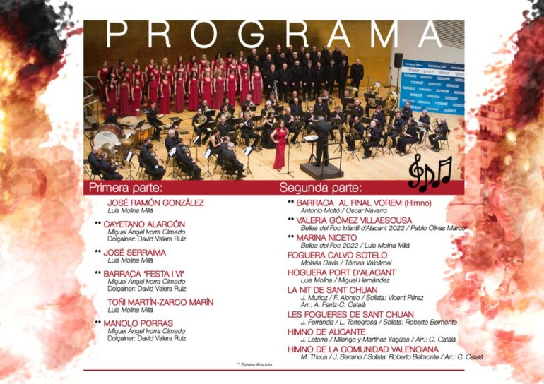 La Banda Sinfónica Municipal de Alicante, bajo la dirección de José Vicente Díaz Alcaina, ofreció un extenso programa en el que, además de los dos pasodobles dedicados a la máximas representantes de las Fogueres de Sant Joan, piezas dedicadas a José Ramón González, Cayetano Alarcón, José Serraima, Toñi Martín-Zarco Marín, Manolo Porras, y otras harto conocidas como ‘La Nit de Sant Choan’, entre otras.
