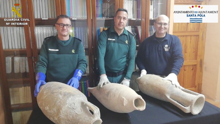 En una actuación coordinada entre el Seprona de la Guardia Civil de Elche y el Museo del Mar del Ayuntamiento de Santa Pola, han sido recuperadas tres ánforas romanas de cerámica, procedentes del siglo I, y que probablemente fueran halladas en uno de los pecios del litoral. La Guardia Civil y el Ayuntamiento de Santa Pola agradecen la comunicación del hallazgo a una ciudadana que las encontró en su domicilio, probablemente adquiridas en algún momento por un familiar ya fallecido.