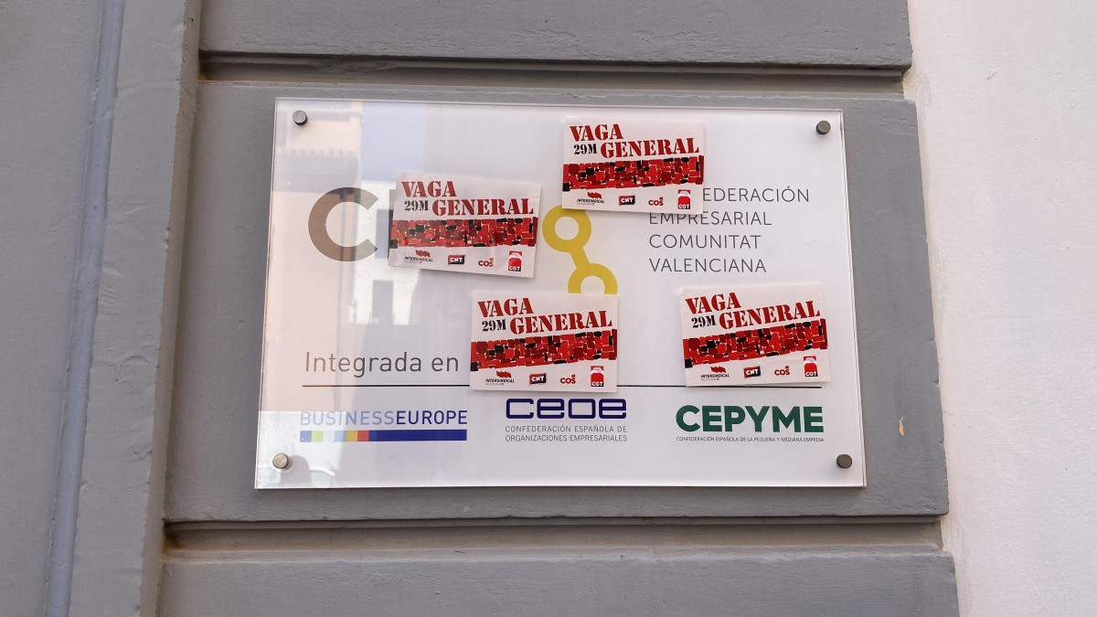 Un grupo de representantes de CGT, CNT, Intersindical Valenciana y COS han okupado la entrada del edificio, desde alrededor de las 11.00 horas hasta poco más de las 12.00 horas, donde han exhibido una pancarta con el lema ‘Vaga General 29 Mayo’ y unas imágenes del ‘president’ de la Generalitat, Carlos Mazón, con la frase ‘Moltes raons per a fer vaga!’ (Muchas razones para hacer huelga).