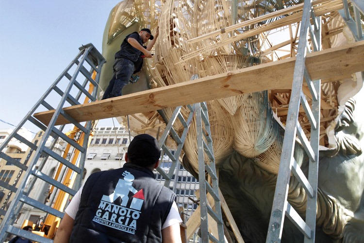 El equipo del artista fallero Manuel García al completo y él mismo ya están trabajando a destajo en la Plaza del Ayuntamiento para ultimar el monumento municipal, que este año recibe el nombre de La Fuerza y consiste en una reproducción de Daoíz, el león del Congreso de los Diputados. Más concretamente, la figura central presenta una altura de 22 metros, el equivalente a un edificio de siete plantas, y un peso total próximo a las seis toneladas. “Implica mucho más trabajo que el Moisés de las Fallas pasadas por sus dimensiones y por el grado de dificultad de la pieza”, ha explicado el propio artista.