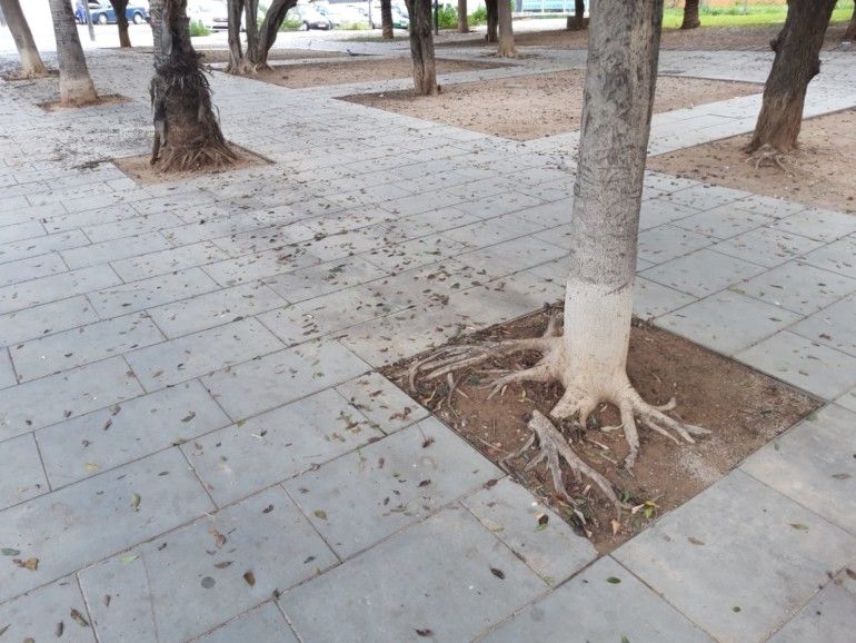 Bajamos la vista el suelo y nos encontramos con algo que debió ser un día un alcorque, para los legos en la materia el agujero, en este caso con forma cuadrada, en cuyo centro se ubica el árbol y cuya limpieza resulta importante, si no crucial, no solo desde el punto de vista estético sino hasta higiénico. La profusión vegetal de la gran mayoría permite ocultar el propio alcorque y en algunos casos cubre gran parte de la acera, dificultando el paso de peatones.