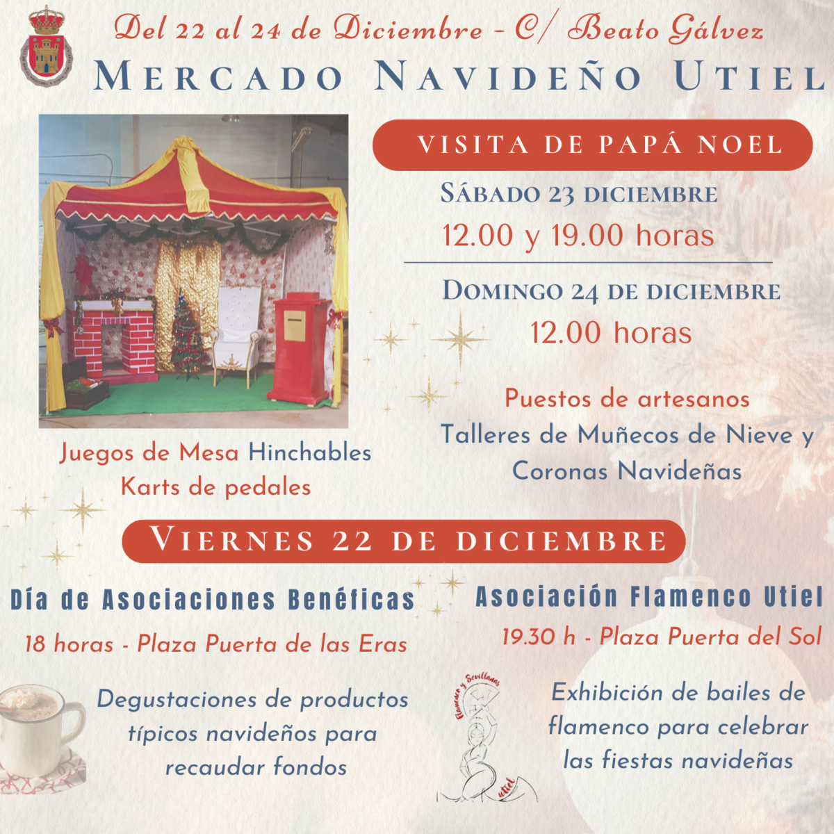 Desde esta tarde a las 17.30 horas y hasta el domingo, el mercado navideño estará instalado en la C/ Beato Gálvez con puestos de artesanos, atracciones de karts, hinchables, talleres infantiles etc. | A las 18.00 horas, en Plaza Puerta de las Eras las asociaciones benéficas de Utiel ofrecerán degustaciones de dulces navideños para recaudar fondos