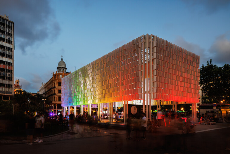El estudio creativo Radiante Lab ha concebido la instalación lumínica de Àgora València con la premisa de poner en valor la arquitectura del espacio, creando una conexión con la ciudadanía, la eficacia energética y la sostenibilidad. Se trata de una pieza de light art inmersiva y masiva que rinde tributo al diseño cada noche, a las 22 horas, iluminando el Àgora València con motivo de València Capital Mundial del Diseño 2022.