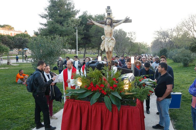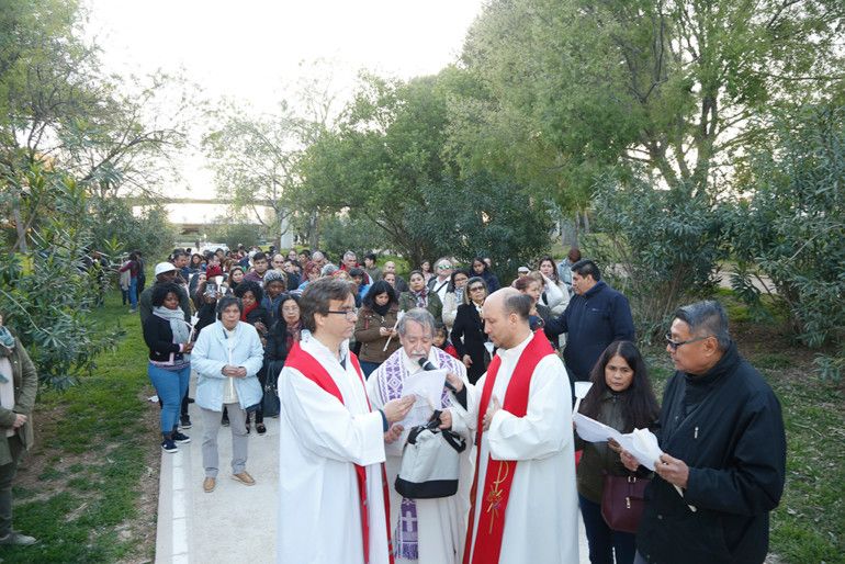Migrantes y refugiados de varias nacionalidades y feligreses españoles de diferentes parroquias participaron este Viernes Santo, en el llamado Via Crucis de todos los pueblos por el viejo cauce del río Turia que partió por la tarde desde el puente peatonal de Ademuz.